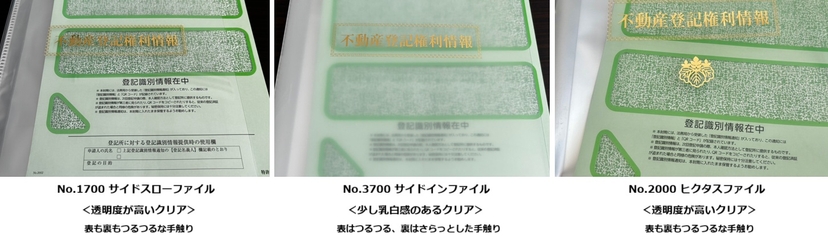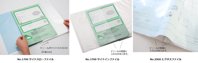 サイドインファイル(中央) と ヒクタスファイル(右) は、ポケットの入れ口が【両面】にあります。