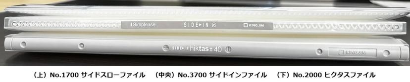 サイドスローファイル(左) と ヒクタスファイル(右) は透明度が高いクリア、中央のサイドインファイルは少しだけ乳白色です。
